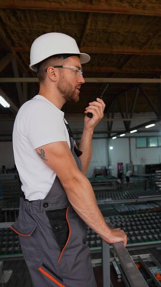 Engineer with walkie talkie giving commands to workers in PVC window factory Pro Video
