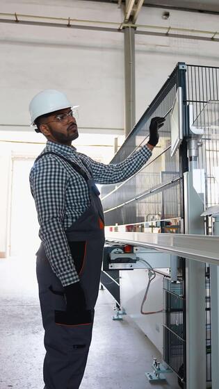 Indian engineer sets up a production line at programmable CNC machine in window factory Pro Video