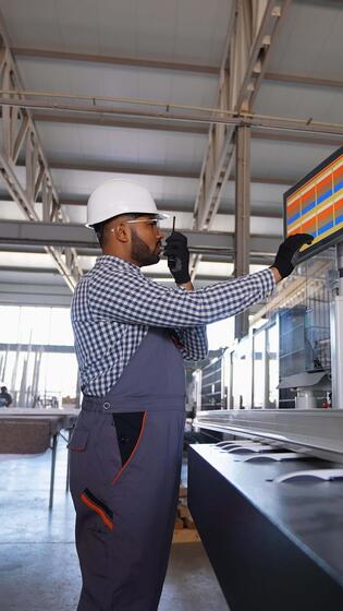 Indian engineer entering data in CNC machine at pvc window factory to get the production going Pro Video