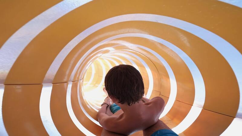 Child filmed from the back sliding through a bright orange water slide with glowing exit Pro Video