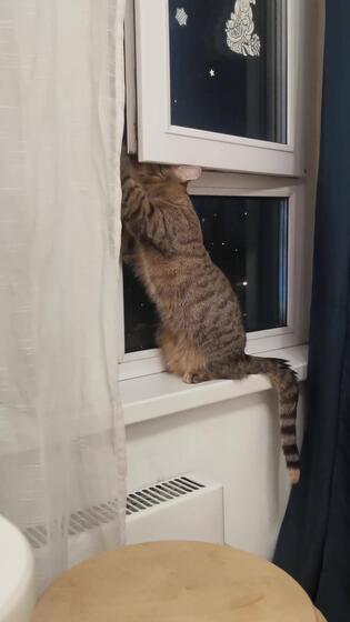 Vertical of curious cat sitting on windowsill and trying to open window Pro Video