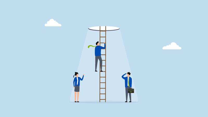 Hopefulness motivation to solve problem, 4k animation of aspire to conquer fear idea, entrepreneur ascend ladder towards illuminated path ahead. Pro Video