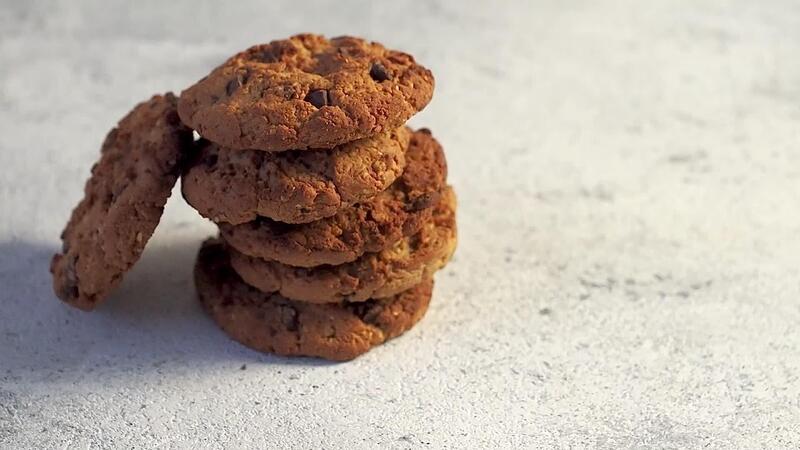 Stack of cookies rotate on gray cement background. Cookie with chocolate, copy space for text. Pro Video
