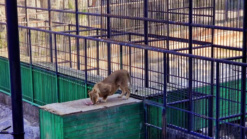 Lioness eating raw meat, standing on green platform in zoo enclosure, displaying predatory feeding patterns of captive large feline species Pro Video