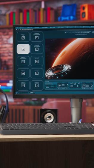 Vertical AI program turning text prompt into videos results. Monitor in desk surrounded by plants showing text to artificial intelligence generative model, handheld camera shot Pro Video