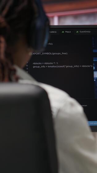 Vertical IT engineer drinking coffee, using computer at home for artificial intelligence computing. Close up of remote worker working with AI deep neural networks on desktop PC, camera B Pro Video