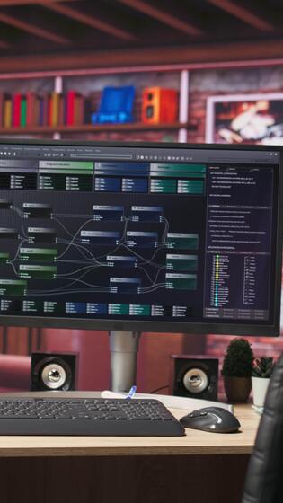 Vertical Programming software UI on computer monitor in apartment office. Machine learning application on PC screen used to write and test code in modern apartment, handheld camera shot Pro Video