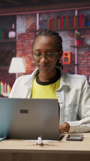 Vertical Worker at home starting job shift, opening laptop to analyze data at desk, compiling analytical reports. Remote employee beginning tasks, using notebook device, writing down information, camera B Pro Video