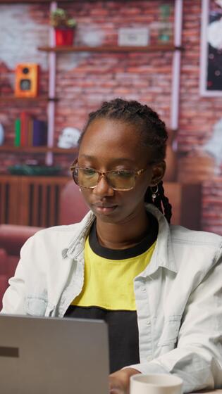 Vertical Remote worker at home office desk drinking coffee and browsing internet on notebook, researching information. Woman enjoying hot beverage while using search engines to find data for work, camera B Pro Video