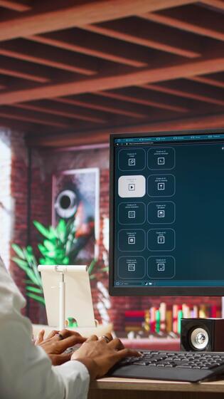 Vertical Woman at home using generative artificial intelligence website generating videos using diffusion models. Person drinking coffee and using AI virtual assistant producing clips, camera A Pro Video