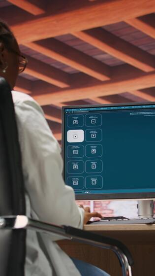 Vertical Woman at home using generative artificial intelligence website generating videos using diffusion models. Person drinking coffee and using AI virtual assistant producing clips, camera B Pro Video