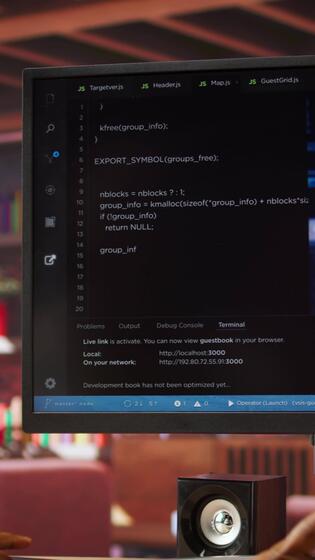 Vertical IT engineer drinking coffee, using computer at home for artificial intelligence computing. Close up of remote worker working with AI deep neural networks on desktop PC, camera A Pro Video