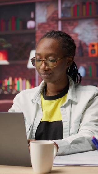 Vertical Bookkeeper in home office studying financial statements on laptop and writing down info. Teleworker in apartment reading documents on notebook and taking notes with pen on paper, camera B Pro Video