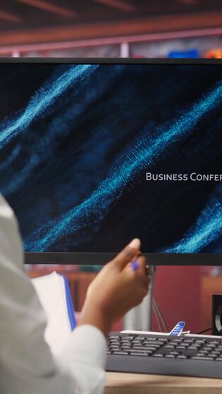 Vertical Student doing online learning for career business development, taking notes while watching presentation. Woman gathering information from internet seminar on computer display, camera B Pro Video