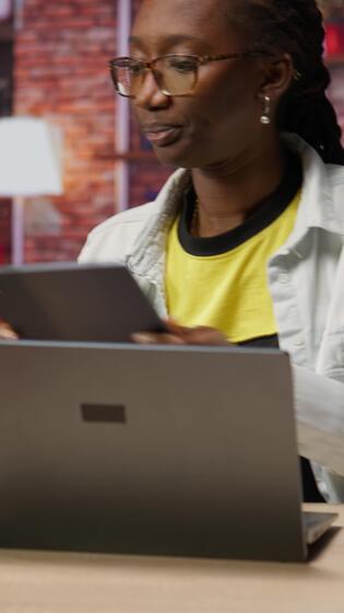 Vertical Teleworker at home happy to end job shift, closing laptop and leaving desk after finishing tracking expenses and syncing statements with digital software on notebook, camera B Pro Video