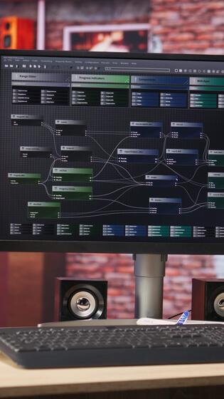 Vertical Software development being done on PC, implementing algorithms. Machine learning app on computer screen in home office used for building applications and optimizing performance Pro Video