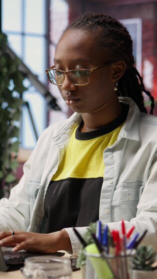 Vertical Portrait of smiling student at home browsing internet on notebook, doing homework, researching information online. Cheerful girl in apartment reading articles on laptop for school tasks, camera B Pro Video