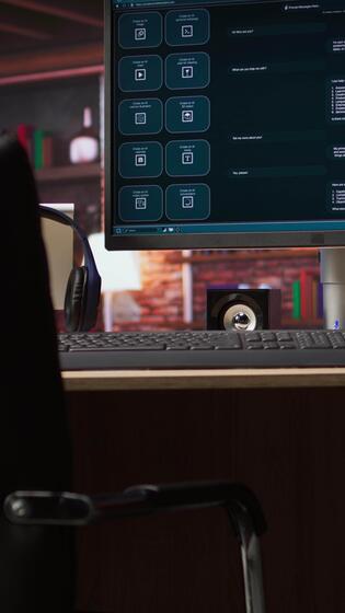 Vertical AI LLM chatbot software interface on PC in home office showing virtual assistant answering user prompts. Large language model program on monitor using artificial intelligence, jib up shot Pro Video