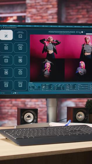 Vertical Computer on desk with UI of artificial intelligence GPT application turning text prompt into photos, handheld camera shot. Internet website on PC screen showing text to image models Pro Video