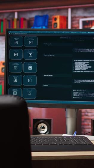 Vertical AI LLM chatbot on computer screen in home office designed to understand human language. Artificial intelligence chatbot on monitor trained on data enabling it to perform complex tasks, panning shot Pro Video
