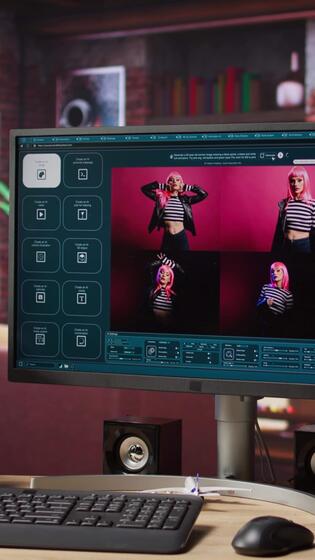 Vertical Computer in home office showing program converting text prompts into photo output. Text to image generative models AI tech software on computer display in cozy bright apartment Pro Video