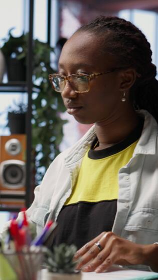 Vertical Teleworker using laptop in home office to crosscheck paper documents with online company files. Remote worker typing on notebook, inputting paperwork documentation data, camera B Pro Video