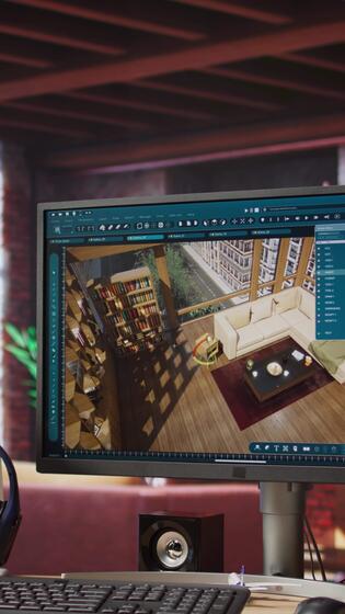 Vertical Architectural design 3D modeling program on computer screen showing rendered apartment interior design project. CAD software used for making home floor plans and virtual furniture Pro Video