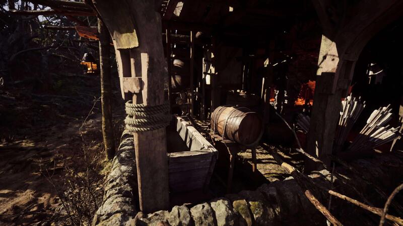 Ancient workshop with barrel and rustic tools in a weathered forest setting Pro Video