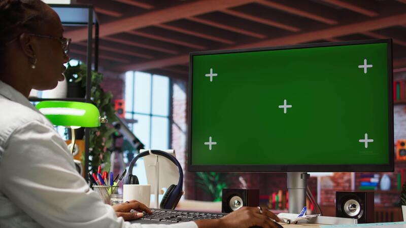 Remote employee using isolated screen PC in home office to write emails, close up. Teleworker typing on chroma key computer keyboard, composing documents, finishing project, camera A Pro Video