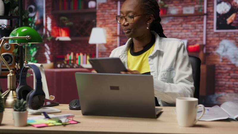 Teleworker at home happy to end job shift, closing laptop and leaving desk after finishing tracking expenses and syncing statements with digital software on notebook, camera B Pro Video
