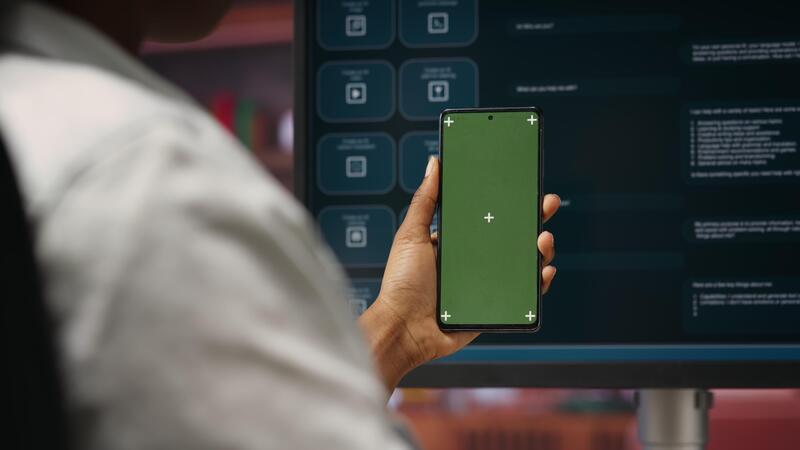 Woman using isolated screen smartphone and AI LLM chatbot on computer screen in home office. Person holding chroma key phone uses artificial intelligence chatbot on monitor, camera B Pro Video