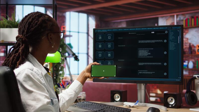 Woman seated at desk using isolated screen mobile phone to follow tutorial on AI LLM chatbot software. African american person uses mockup smartphone in apartment and GPT program on computer, camera A Pro Video