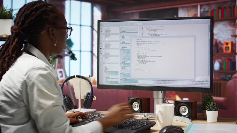 Engineer in home office looks at UI on computer monitor, typing and executing programming code. Panning shot of IT worker using coding application to write and test code in modern apartment, camera A Pro Video