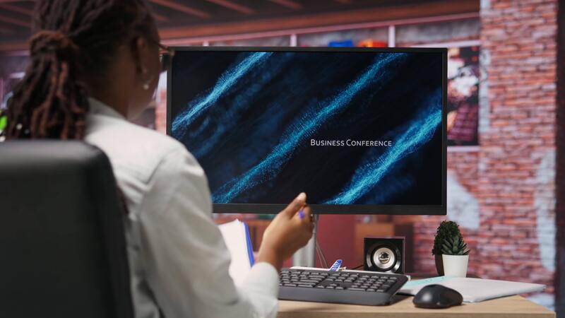Student doing online learning for career business development, taking notes while watching presentation. Woman gathering information from internet seminar on computer display, camera B Pro Video