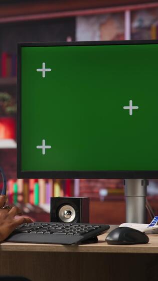 Vertical Teleworker using green screen PC in home office to write emails. Remote worker typing on mockup computer keyboard, composing documents in order to deliver finalized project paperwork, camera B Pro Video