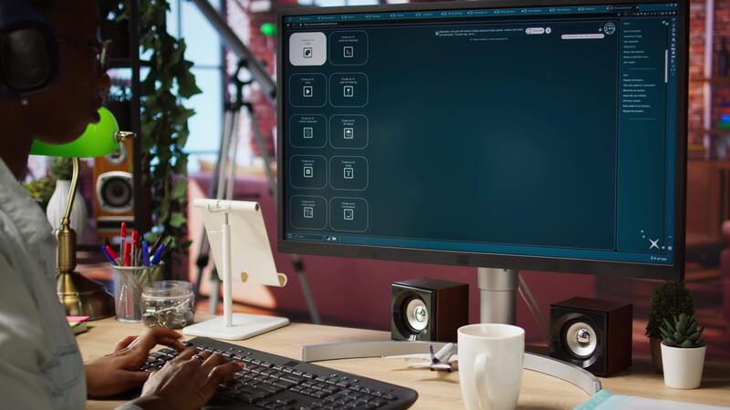 Woman in apartment using AI software turning text prompt into photos, drinking coffee and listening music. African american person in cozy home uses text to image generative models on PC, camera A Pro Video