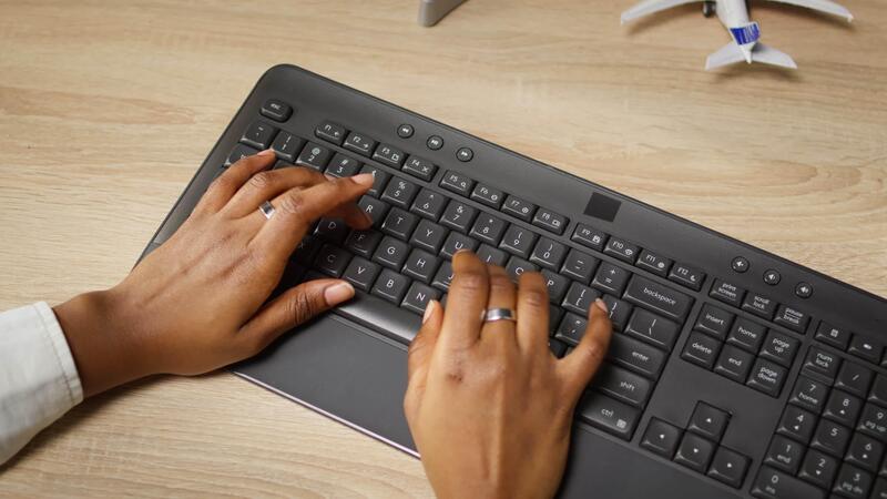 Person at home office desk typing on PC keyboard next to coffee mug, close up shot. Remote employee in apartment pressing computer peripheral keys, inputting data, camera A Pro Video