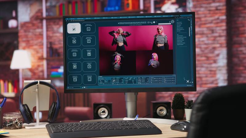 Computer on desk with UI of artificial intelligence GPT application turning text prompt into photos, close up. Neural network tech using text to image models, handheld camera shot Pro Video