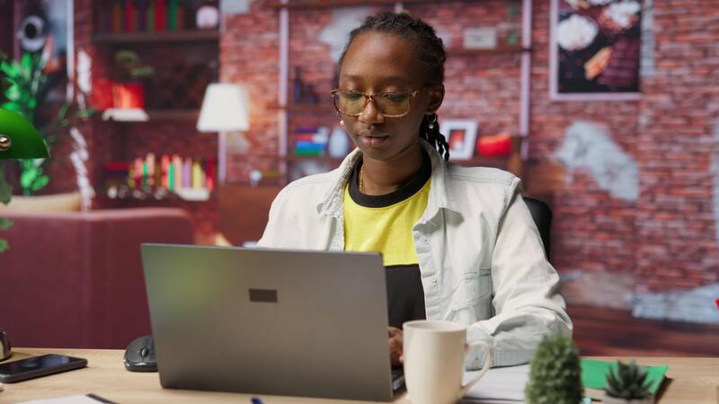 Teleworker drinking coffee while using notebook at home to write emails. Remote employee enjoying hot beverage and using laptop, composing documents to deliver finalized project paperwork, camera B Pro Video