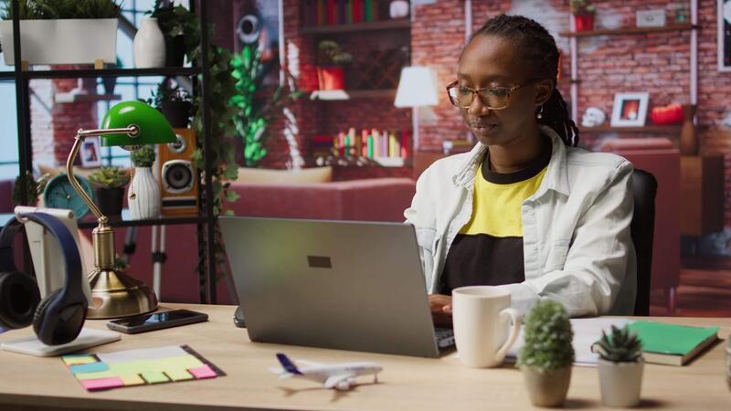 Remote worker at home office desk drinking coffee and browsing internet on notebook, researching information. Woman enjoying hot beverage while using search engines to find data for work, camera A Pro Video