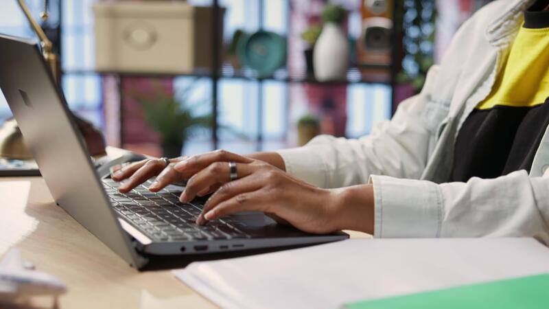 Teleworker typing on notebook keyboard in home office to write emails. Remote worker using laptop, composing documents in order to deliver finalized project paperwork, camera B close up shot Pro Video