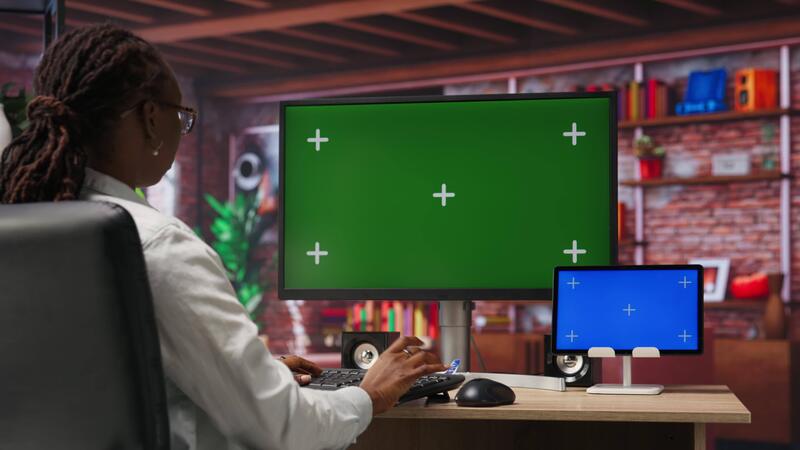 Woman browsing social media at home using isolated screen computer display and tablet. Person talking with friends on social network online website using chroma key PC and mockup device, camera B Pro Video