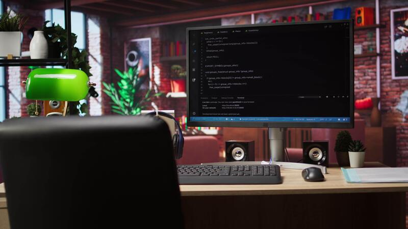 Development console visible on computer screen in modern apartment workspace. Software tools and lines of code displayed on PC monitor in home living room, technology concept Pro Video