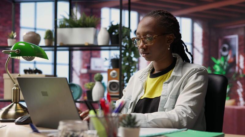 Freelancer at home checking analytics statistical data sets on laptop, comparing with paperwork files. Woman optimizing key performance indicators on notebook by crosschecking with documents, camera B Pro Video