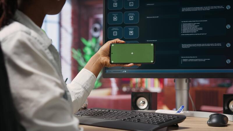 Woman seated at desk using isolated screen mobile phone to follow tutorial on AI LLM chatbot software. African american person uses mockup smartphone in apartment and GPT program on computer, camera B Pro Video