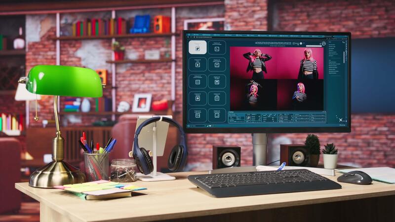 Computer on desk with UI of artificial intelligence GPT application turning text prompt into photos, handheld camera shot. Internet website on PC screen showing text to image models Pro Video