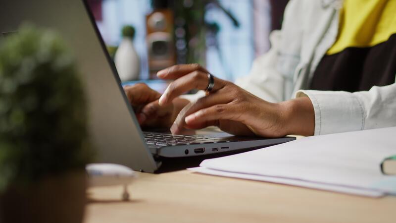 Teleworker typing on notebook keyboard in home office to write emails. Remote worker using laptop, composing documents in order to deliver finalized project paperwork, camera A close up shot Pro Video