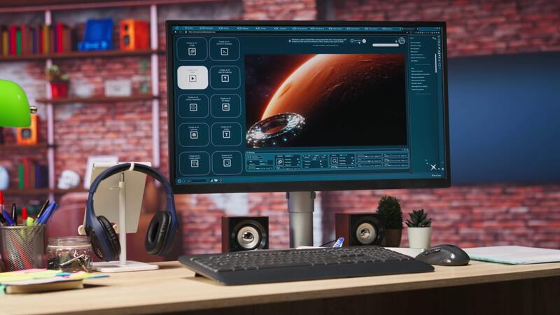 Computer screen with AI program turning text prompt into videos results. Display in apartment surrounded by plants showing text to artificial intelligence generative model, handheld camera shot Pro Video