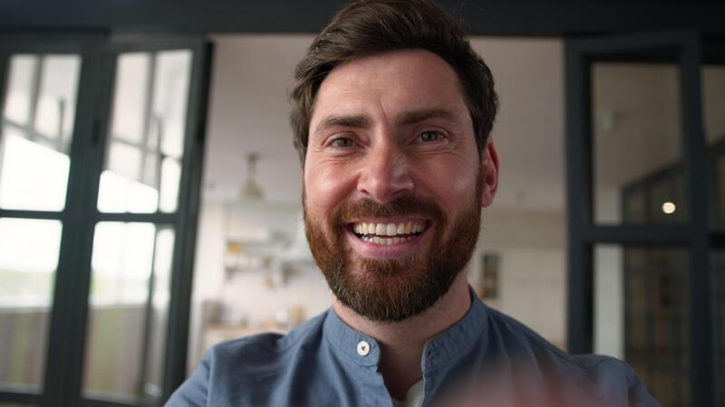 Happy Caucasian man father typing mobile phone smartphone display dad guy smiling browsing net parent using device cyberspace AR touchscreen glad male chatting online at home internet app POV webcam Pro Video