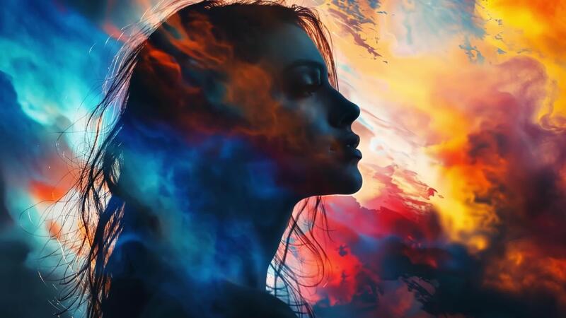 A silhouette of a person is artfully integrated with vibrant, abstract colors and swirling clouds, creating a mesmerizing visual. The scene captures an enchanting blend of creativity and emotion. Pro Video